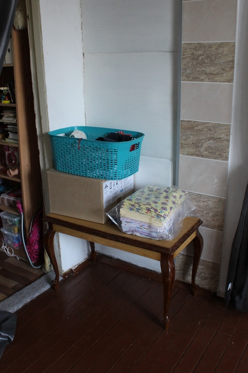 Любимый ХС - журнальный столик в гостиной. Корзина с неразобранным высушенным бельем, коробка с вещами "отдать", пеленки, которые ушли в детский шкаф.