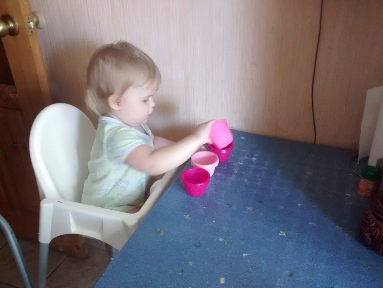 Следующий пункт УР - вымыть посуды и начистить раковину. Но для этого сначала надо занять ребенка - наливаем в силиконовые формочки воду, а она переливает ее:
