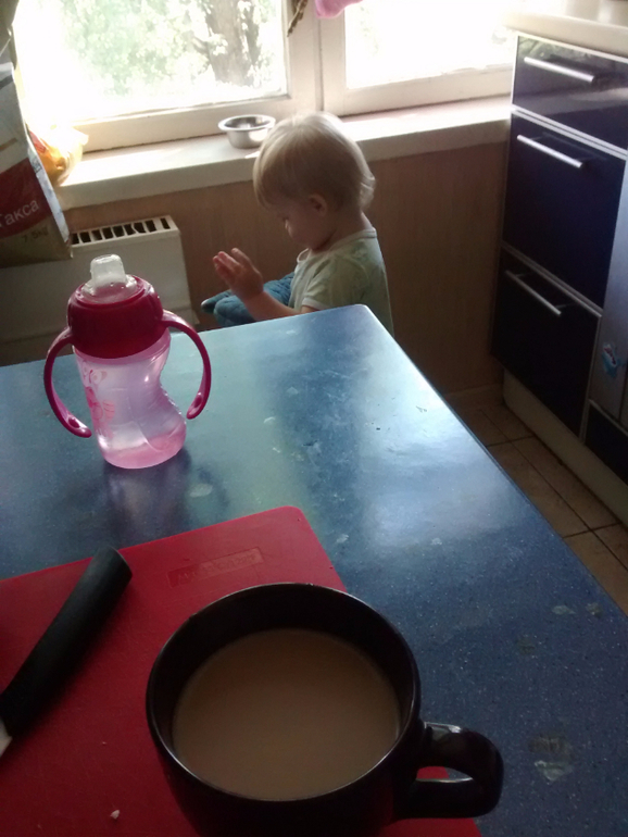 Лика поела и пошла играть, а у меня есть возможность выпить кофе с молоком