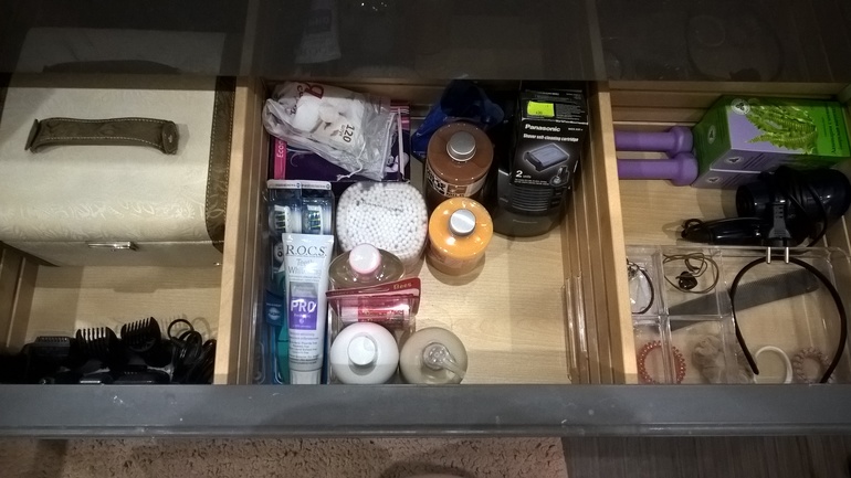 В этом ящике у меня лежат "запасы" - мыло, шампунь, зубная паста и т.д. В другом отделении резинки и украшения, которые я ношу каждый день. В третьем шкатулка с остальными украшениями и машинка для стрижки.
