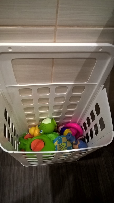 Шампуньки у нас хранятся в корзине на присосках. В планах купить полочку и присверлить на постоянное место (для шампунек моих и мужа), а эту с присосками для детей.