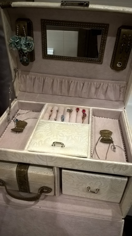 Украшений у меня не очень много, они хранятся в шкатулке в ванной комнате. Это не очень удачное место, наверное, с точки зрения влажности и т.д. но пока так. Когда будет туалетный столик поставлю туда. Шкатулка большая и заполнен только верх))) Все остальные ящички пустые)))