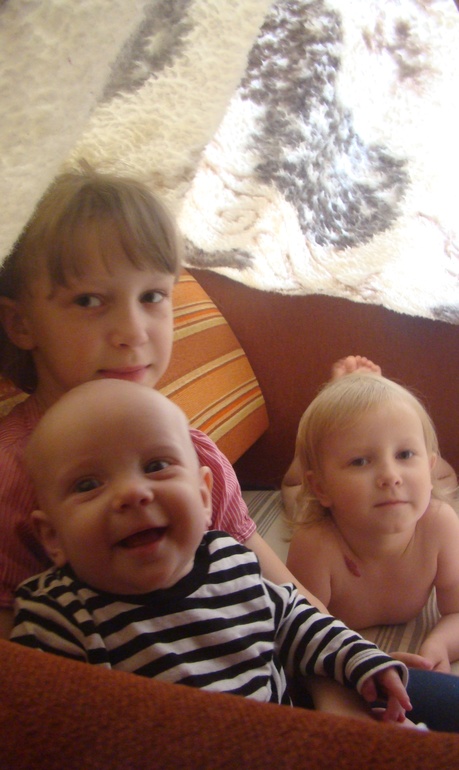 13:00-пошла готовить кушать. Заглянув в комнату через 5 минут-увидела такую картину. Быстро они домик из дивана сделали и младшую к себе с пола переселили.