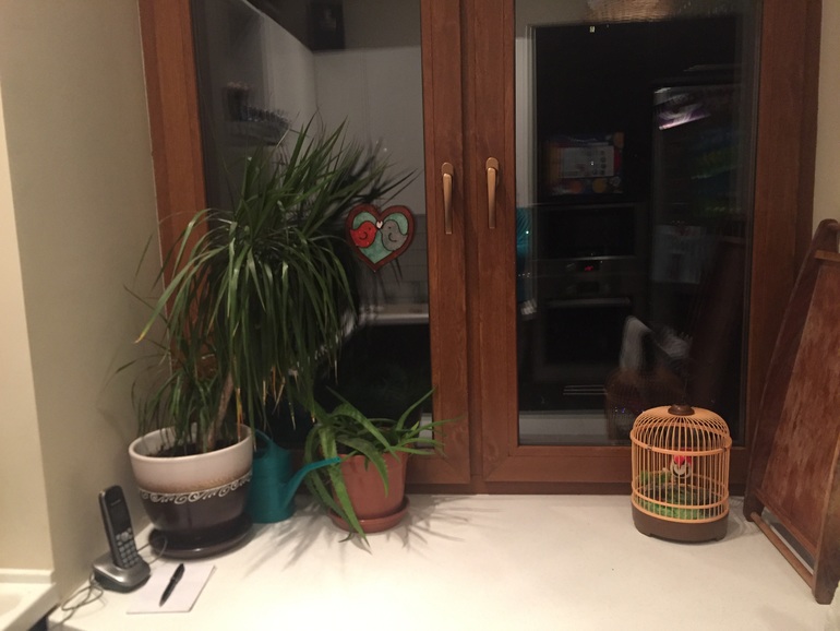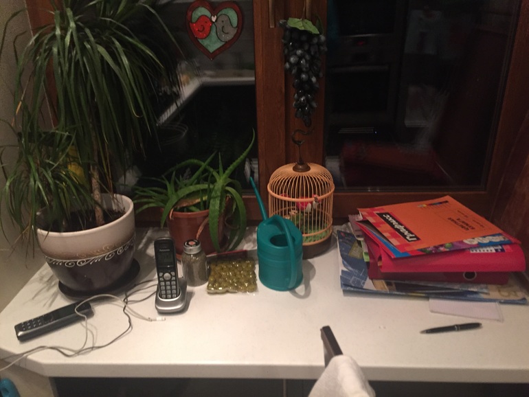 5. Подоконник на кухне - в основном зарядки для телефонов, журналы и бумажки