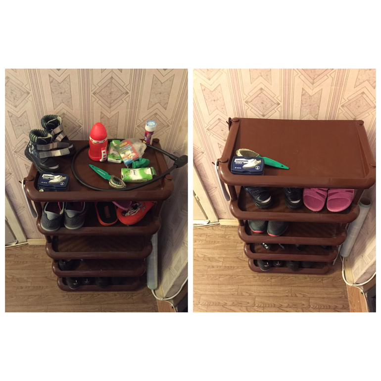 14-30- мою посуду, раковина чистая, теперь можно заняться ХС, сегодня у меня была обувная полка в коридоре. Я убрала с неё все лишнее и протерла влажной тряпочкой.