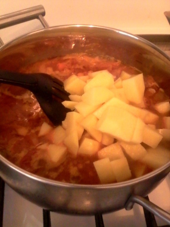 В ваджи добавляем бульон от лапши+ немного воды, общее колл-во должно получится около 2 литров. Как закипит добавляем картошку и специи и тушим на медленно огне 30-40 минут.