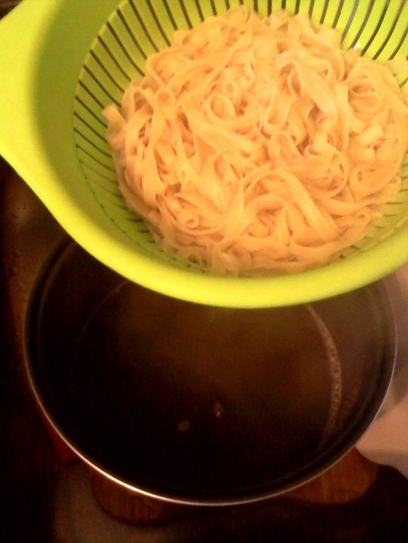 параллельно отвариваем лапшу, воду сливаем не в раковину, а в какую-нибудь тару,