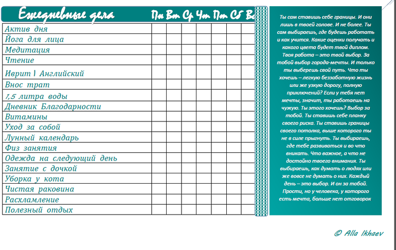 В этой таблице я каждый день отмечаю , тем же фломастером, галочкой, что сделала и в конце недели все вытираю . Так я наглядно вижу если в каком то пункте у меня есть проблема и надо над ней работать. Так же на этом листочке я добавила Мотивашку ,которая мне ну очень понравилась Это прямо Мантра для меня, каждое утро когда я пью первый стакан воды я читаю ее, это дает сразу правильный настрой на весь день.