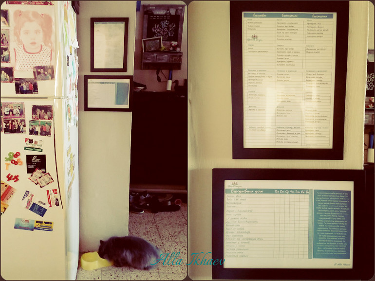 Я купила самые простые рамки для фотографий в формате А4 и вставила туда свои бланки. Нашла укромный уголок возле холодильника и разместила их там, так как на кухне я часто прохожу мимо этого места, то вижу эти списки и не забываю ничего.