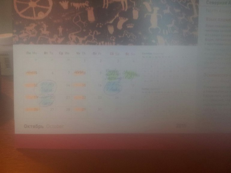 Отчитываемся по заданиямУ нас есть календарик на кухне, где я давно отмечаю все возможные мероприятия (их не так много, к сожалению). Детские развивашки отмечаю оранжевым цветом, зеленый - важные мероприятия вне дома (поликлиника, МФЦ и т.д.), голубой - дни рождения.