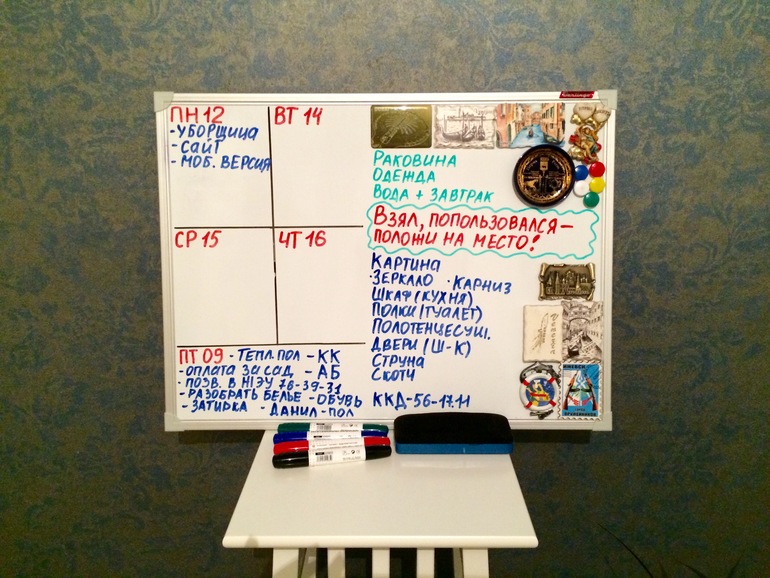Стикеров у меня нет, да и не хочется мне их клеить, честно говоря, зато у меня есть вот такая "Доска визуализации", как я её называю. Купила пару месяцев назад, очень удобно! Стоит на кухне, всегда перед глазами: