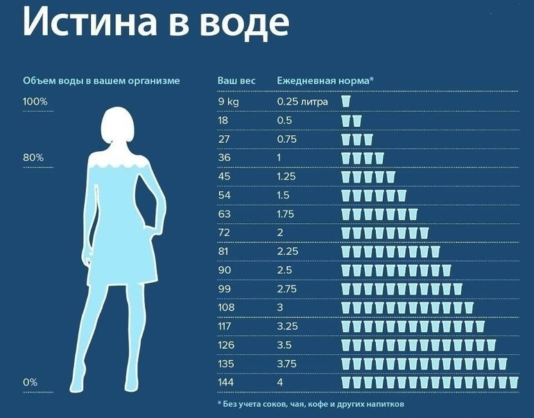 В течение дня, хотите ли вы или нет, необходимо выпивать от двух до трех литров чистой питьевой воды. Для подсчета более точного количества воды следует исходить из расчета 40 мл на каждый килограмм вашего веса.