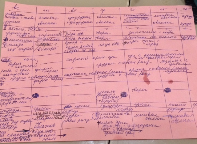 висит на холодильнике рядом с плитой, с обратной стороны пишутся хотелки на следующую неделю и продукты, которые закончились и нужно пополнить.
