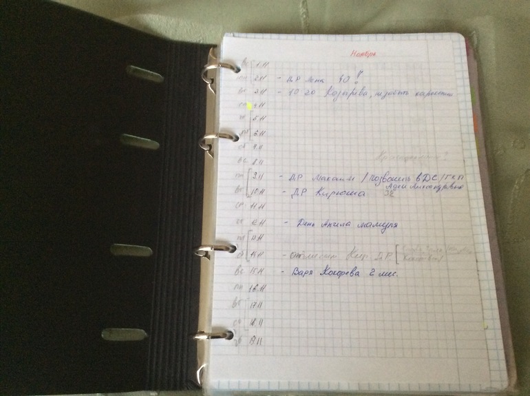 Опытным путем пришла к тому что в самом начале тетрадки мне нужен календарь, пишу его сама сразу на год ( одна страница - один месяц, на 2016 сделала еще календарь на 12 месяцев на одной станичке)