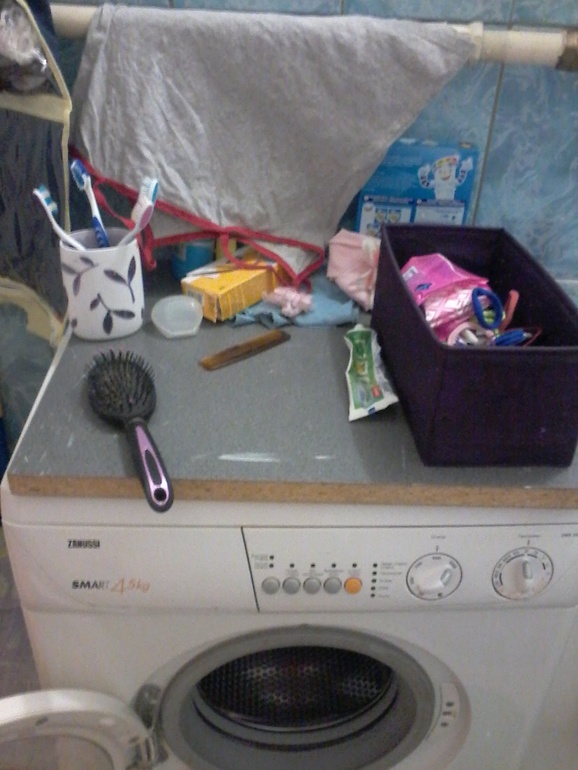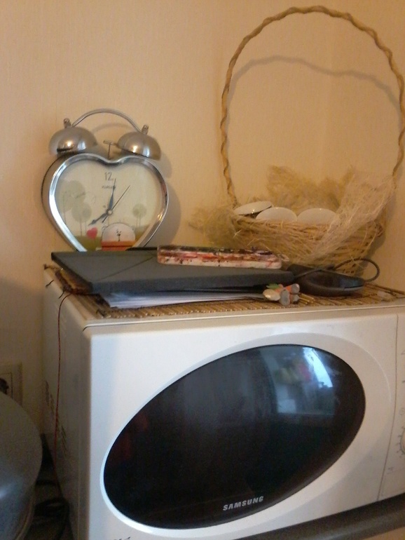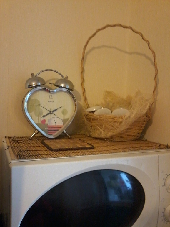 Микроволновка, стиралка, шкаф в коридоре, подоконник в комнате.