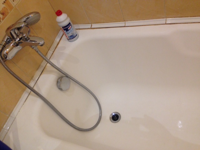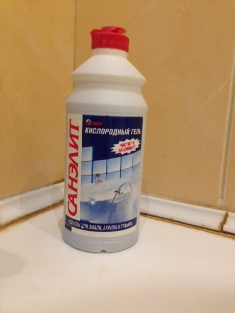 Вооружаемся резиновыми перчатками, губкой или тряпкой, и химией-будем отбеливать нашу ванную. Я беру доместос и тщательно распределяю его по всей ванной,оставляю на минут 10-15 и тщательно смываю.
