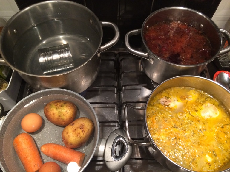 А потом я казак наготовила ))) Сварила рассольник, компот, испекла булочки, поставила варить овощи на завтрашний оливье и поставила варить сгущенку