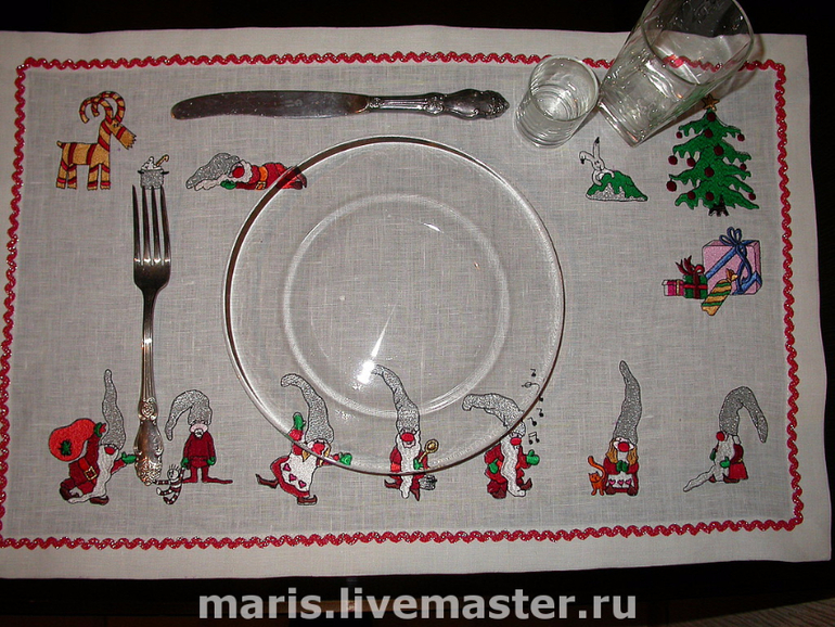 О новогоднем текстиле все годы только мечтаю. Надо вписать уже в план. Каждый год хочу вышить, потом понимаю, что уже не успеваю и успокаиваюсь еще на год )))) Очень понравилась идея фартуков для бутылок, аж жаль, что практически не пьем. Но на шампанское все же надо сделать.