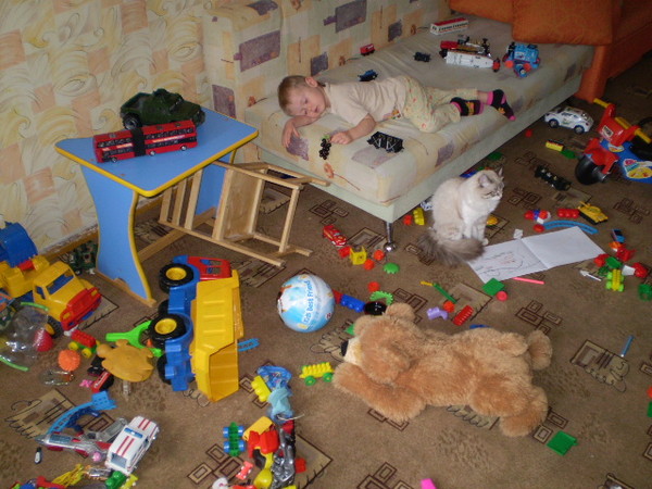 Ага: кошка имеется, мотоцикл тоже, и воооон тот зелёненький конструктор... разве что сын сам не засыпает ))) Младший у меня сейчас всё в порыве гнева и не удовольствия швыряет, колотит и ... плюется.