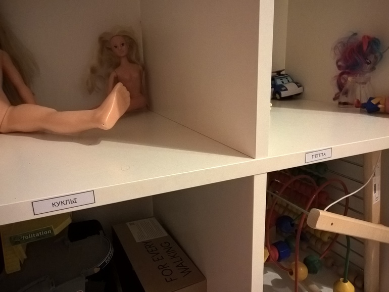 Наклеила везде этикетки на детском стеллаже (это только часть). Хотела в Икее купить коробки еще, но был очень ограниченный бюджет. Не уложилась.