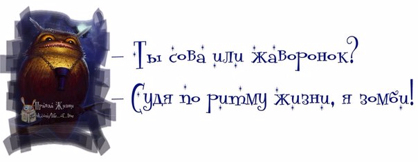 Да, иногда я - чокнутая птичка, а иногда - зомби. Т.к. я ложусь в час ночи (а то и позже), а встаю в 7-8. Сына я стараюсь укладывать пораньше. Сейчас, правда, получается в диапазоне с 20 до 22. Когда начали ходить на занятия - сбился режим дневного сна, пришлось его сдвинуть, и автоматически сдвинулось время ухода ко сну. Но все равно стараюсь укладывать как можно раньше. Чтобы было больше свободного времени. Муж приходит в 23, я и его спать укладываю )) А потом дальше сижу. Учу языки, работаю, читаю, участвую в различных марафонах )) Не могу я без этого всего. Буду тогда чувствовать себя неполноценно. А на другое время все эти дела сдвинуть не удается.