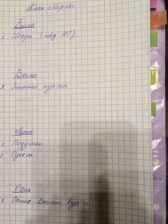 План стирки на год написала по сезонам, а то у нас можно в зимних куртках и в апреле ходить, и в осенних в декабре (.