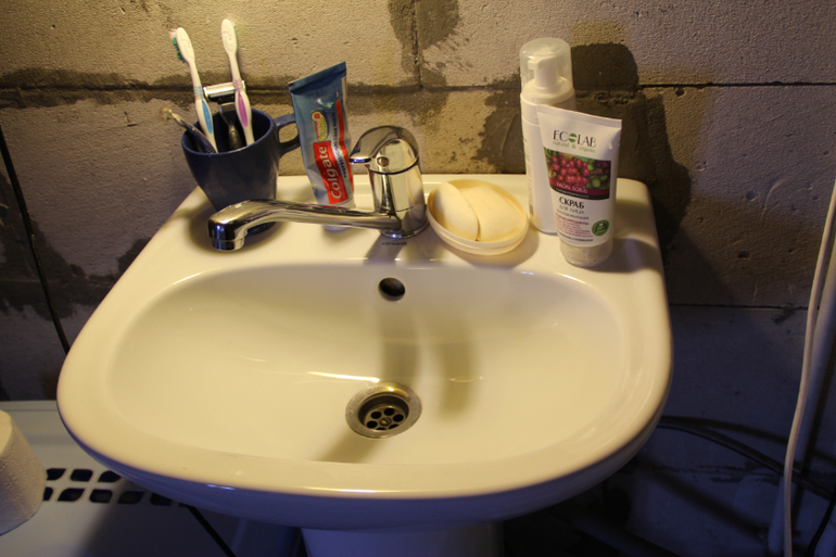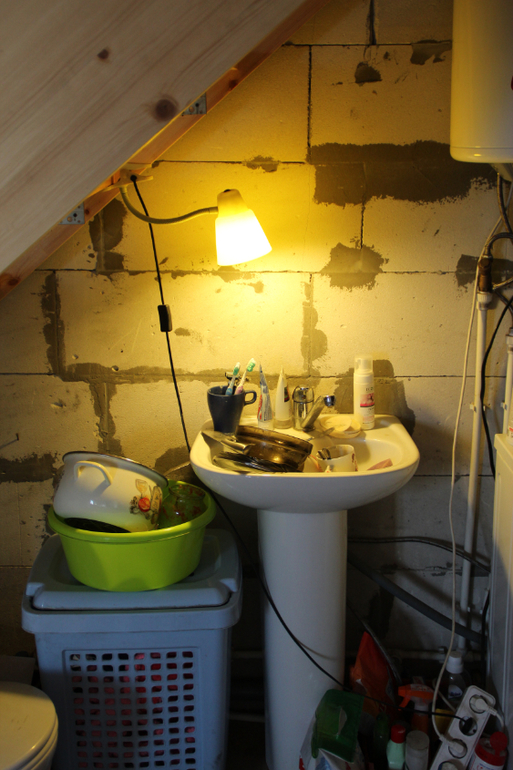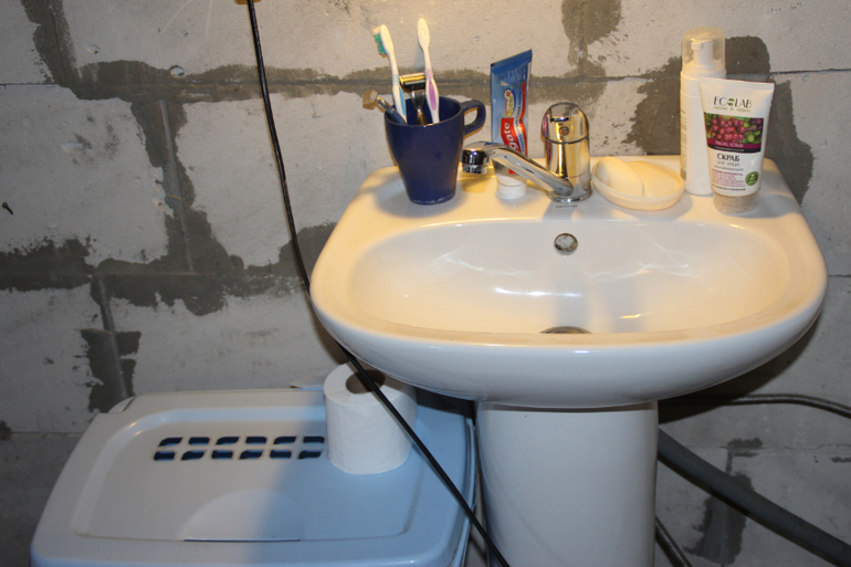 кухонная зона у меня на первом этаже, а вот раковины в ней нет.. сначала посуду мыла в тазике, потом пожалела все-таки свою поясницу, бегать с ведром до компостной кучи тяжеловато, и теперь моя раковина определена в санузле... выглядит это вот так: