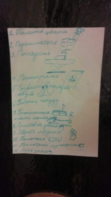 Со старшим сынулькой периодически пишем вместе список дел на день (я пишу,он зарисовывает), после выполнения он с радостью идет вычеркивать выполненное, и сразу ребенку хочется участвовать в уборке.