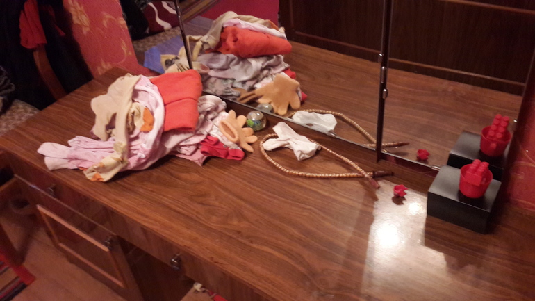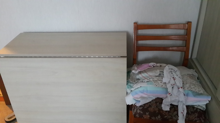 5. И последнее - это стол и стул в зале. На столе в этот раз ничего не было, рядом стопка глажки, которая потом увеличилась, перекочивала из одной комнаты в другую. Глажки у нас всегда очень много, 5 человек, а глажу я ОООЧЕНЬ медленно