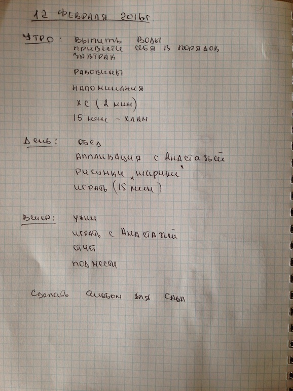 Отчитываемся по заданиямПишу сразу за два дня, так как задание по приготовлению одежды уже входило в мою вечернюю рутину. Из моего личного в вечернюю рутину могу добавить только раскладывание игрушек по местам (пока это еще делаю я) и хотелось бы (но не всегда получается) выделить время на рукоделие, которое надо доделать... А в остальном все прекрасно! Летим)