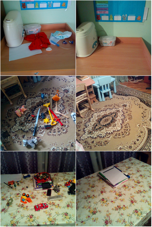 В КЖ записала хотстопы, в моем случае это: пеленальный комод, как не странно, но пол в нашей комнате, там чистоты никогда нету, младший все игрушки тащит из одной комнаты в другую и все они на полу. С пола я убираю по 100р в день, потому для меня это хотспот. В коридоре под зеркалом, в др.комнате - стол, ну и столешница на кухне, все что несется из комнат (а у нас любят кушать по комнатам) идет на столешницу, сколько там не убирай, постоянно что-то наложено. Или утром, когда все поели и начинается моя утренняя рутина - уборка кухни,это обязаловка.