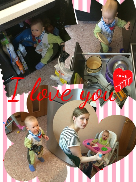Пока я несла мусорный пакет ко входу(дабы папа не забыл его выбросить), мой ребенок залез под раковину и был жутко недоволен, что я его от туда вытащила. Пошел по ящикам с кастрюлями. Проводили папу и Мишаня принес мне свой батинок с намеком "гулять топ-топ"