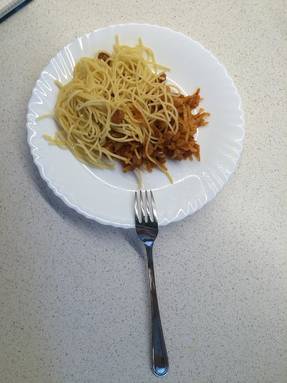 13:20 Мой обед.Спагетти с бигусом. Да я знаю, что бигус самостоятельное блюдо. Но мне захотелось и того и другого))