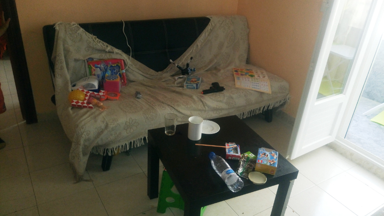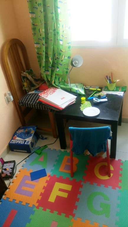 Гостиная. Мой больной сын слегка попрыгал на диване и вытащил игрушки. Убрались вместе: