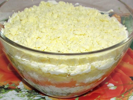 С самого верху посыпаем салат яичными желтками. Их можно просто растереть руками. Готовый салат накрыть пищевой плёнкой или фольгой и убрать в холодильник пропитаться. При подаче, салат нарезается как торт. Приятного аппетита!!!