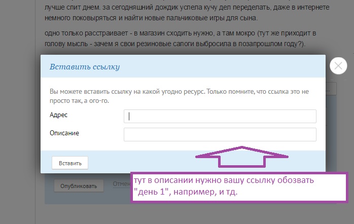 Первый раз вы публикуете ссылку в своем комментарии - пишите "День 1", выделяете курсором и добавляете ссылку на свой отчет