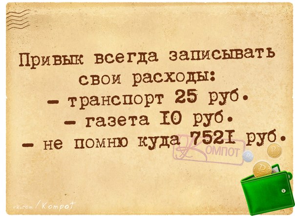 Вчера мы с вами завели тетрадочки/установили приложения, а с сегодняшнего дня мы будем записывать ВСЕ наши траты… до копеечки. Совершили покупку - не забудьте расписать в тетради, оплатили квитанции - внесите в журнал расходов. Не имеет значения, в какой форме вы будете это делать, главное чтобы потраченная сумма соответствовала записанной, ну и конечно чтобы вам было удобно вести учет.