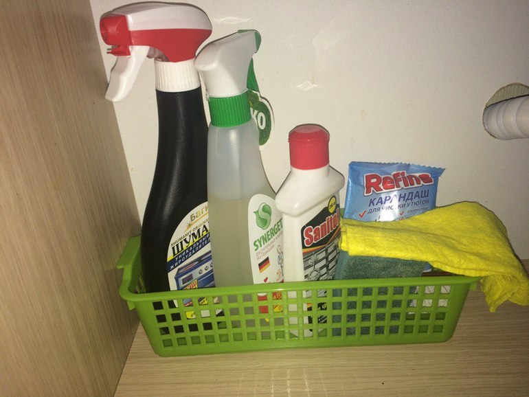 Часть моих помощников в уборке хранится под раковиной на кухне, другая часть в шкафчике в туалете. Вот то что на кухне: