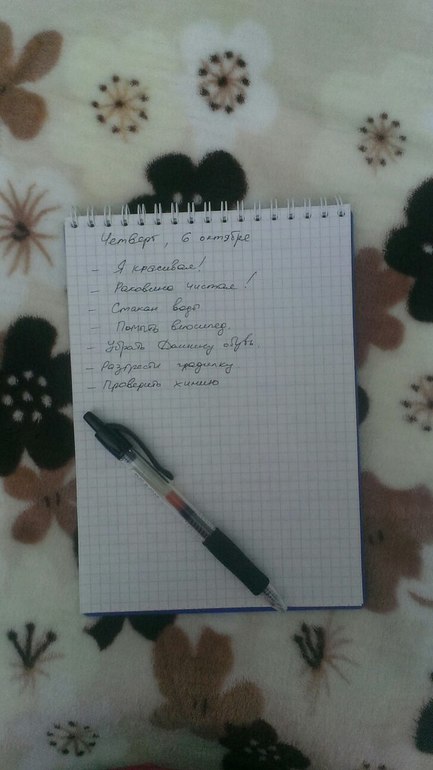 Только пока просьба писать не все подряд дела, а пока только то, что я говорю. Эти несколько дел, должны войти в привычку, в рутину, потом мы их будем делить, что выполнять утром, что - вечером.