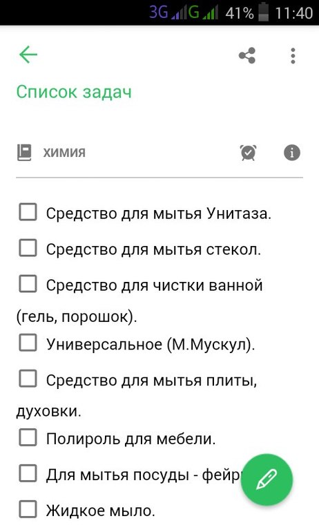 Часть уже сделано. Но, вообще то мне удобнее вести списки в программе Evernote. Так как, списки составляю в основном пока лежу рядом с ребенком. И отмечаю там же сделаное. Вот составила там список Химии, что нужно для удорки дома. Распечатываю. Помечаю что есть дома, остальное докупаю.