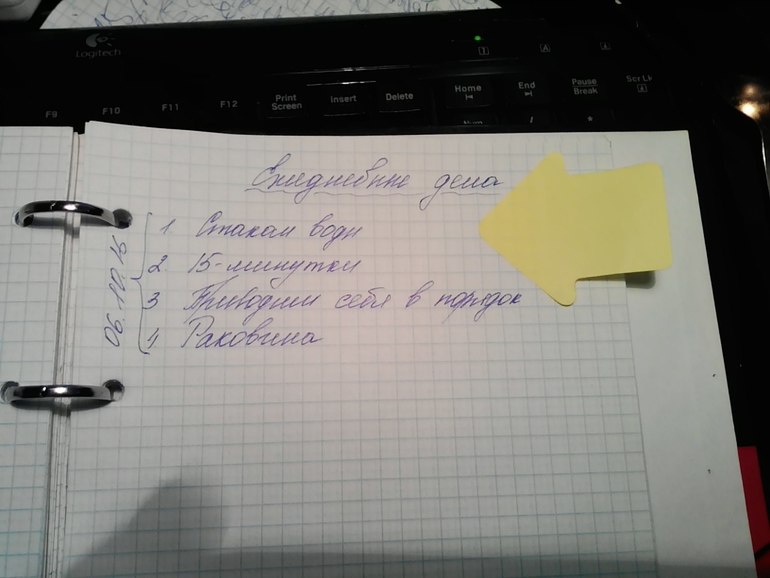 С самого утра в бегах, то с кумой, то сама, то на танцы с дочкой, о которых я совсем забыла, т.к. бабушка водила раньше. Домой попала только к 20.00. Но воду утром выпила, в порядок себя привела и успела осуществить одну 15-минутку - собрать грязные вещи по квартире и засунуть в машинку. Остальные 15-мин после возвращения: помыла зеркало в ванной и умывальник, и убрала на полке с книгами. Сегодня во время вложилась, даже с книгами быстрее управилась. КЖ у меня есть и сегодня докупила ручки цветные, но дочка благополучно их у меня забрала (обещала делится). Задания записала.