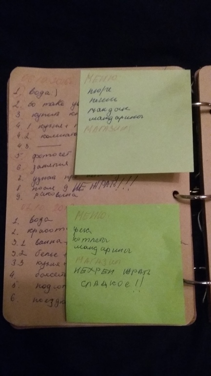 И вот туда же я решила довнести планы на день. Итак, получилось: отдельная страничка бюджет, потом планы на день для меня и напоминалки для мужа, сколько влезет на страницу. На стикерах меню и списки для похода за продуктами. Отдельные страницы для прочих списков. И как нибудь добавлю туда семейные фото, когда нас станет больше. рядом со списками приданного точно☺