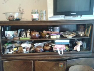 телевизор, полки с книгами, сервант