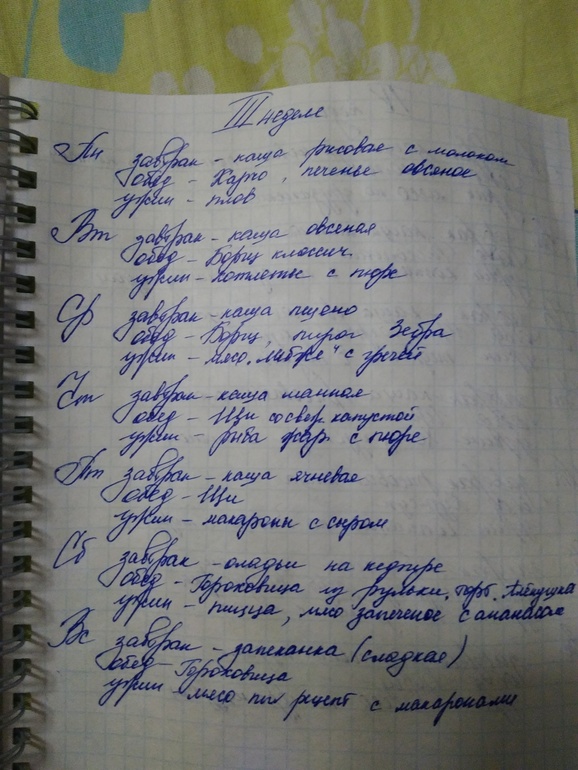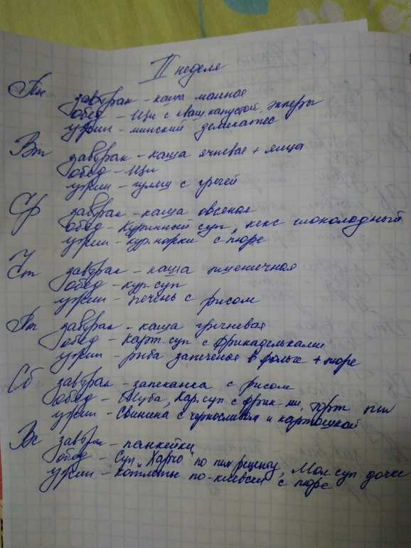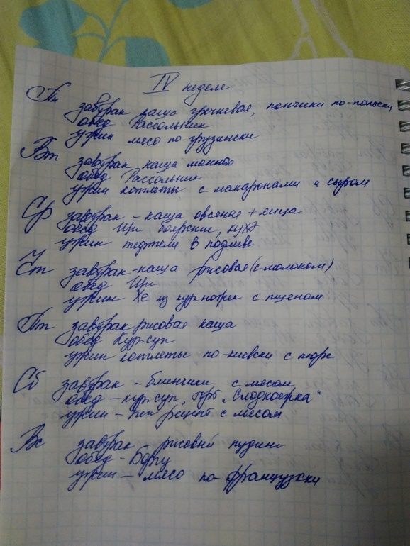 Отчитываемся по заданиямЧто на ужин? Благодаря взлету я не только навела порядок дома,но и наконец то пришла к меню. с готовкой у меня сложные отношения- мужу все нравится,а мне вот не очень. Постоянно экспериментирую,постоянно стараюсь что-то добавить новенькое в рецепт, очень к себе требовательна... давно мечтала составить меню,пробовала и в итоге все меня не устраивало,не хватало разнообразия. После работы в дс,я поняла что я слишком мало брала дней для меню и вот сейчас разработала меню своей семьи. Оно состоит из 4 недель. Суп я готовлю на 2 дня, остальное всегда свежее,особенно ужин. Правда торты и печенье пеку не так часто. Напряглась я за эти пару дней,переписывала несколько раз,чтобы было реально приближено к жизни. Вот что получилось