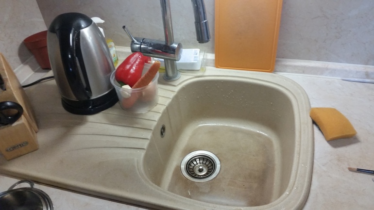 По заданию: раковину начистила. Блеска в ней мне не видать: она каменная. И, к огорчению моему, досталась мне в печальном состоянии: в трещинках и сколах. При подготовке к полёту прикупила в магазине меламиновую губку. Сегодня опробовала на раковине и столешнице. Отлично оттирает эти поверхности. Однозначно буду покупать в будущем, эту стерла до дырок.