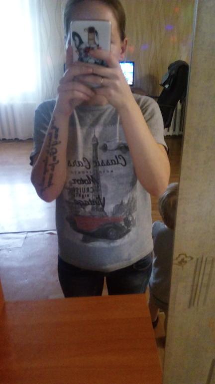 Вещи еще в прошлом взлет я перебрала, все старье выкинула, новое прикупила. Показывать свои жалкие полторы полочки не буду, там не интересно, я люблю белый, серый, черный. Так что цветных пятен раз -два и все. Дома я ношу три варианта, шорты-майка если без выхода на улицу (бывают такие дни, треньки натяну и до сарайки добежать, потом снимаю и опять в шортах), спорт штаны и футболка, это если долго у дома надо поработать. Ну и джинсы с футболкой, если я 100% знаю что на выход или кто в дом прийдет чужой. Чаще всего третий вариант ношу, мне комфортно и тепло в джинсах, если уборка то одеваю после нее. Сегодня я выглядела так