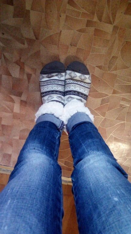 Обувь есть, тряпичные кеды на шнурках, две пары. Но я забыла о них, надо перестирать. Пока ношу теплющие носки с антискользящими пупырками ;)