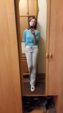 А вообще у меня есть домашние платья, туники с леггинсами, юбки... Хочу больше, но для этого нужно время. Обувь - балетки. Летом босоножки без каблука