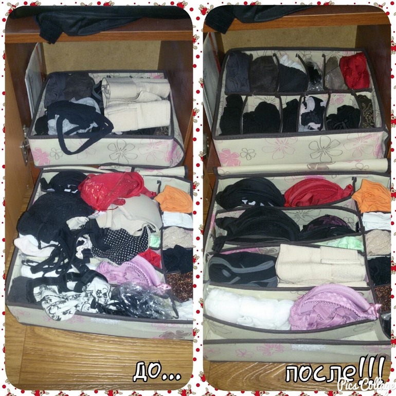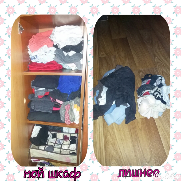 шкаф разбирала недавно, поэтому особого беспорядка там нет, но все равно еще раз перебрала и всеже решилась выбросить несколько вещей, рваные джинсы и 3 кофты вышедшие из своего товарного вида. а вот с нижним бельем , носками, колготами пришлось попотеть... много выбросила, УРА!!!!