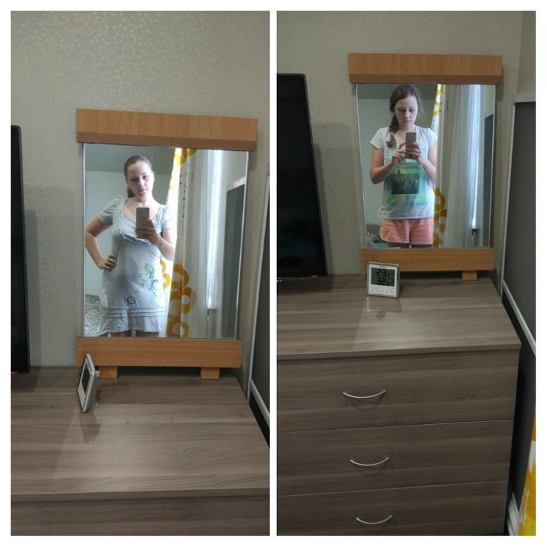 Про задание прочла лежа в кровати. Зеркала в нашем временном присталище нормального нет, пришлось вместиться в то, что есть. Вообще вывод дня - надо побаловать себя и купить красивую одежду для дома и тапочки. На фото справа я только проснулась. А слева я умылась, переоделась и причесалась... разницы нет))) Надо учиться делать красивые, но легкие и быстрые прически!
